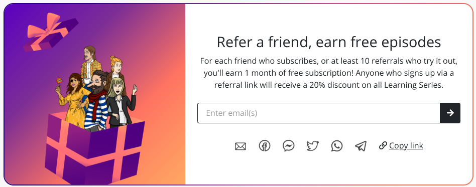For each friend who subscribes, or at least 10 referrals who try it out, you'll earn 1 month of free subscription!