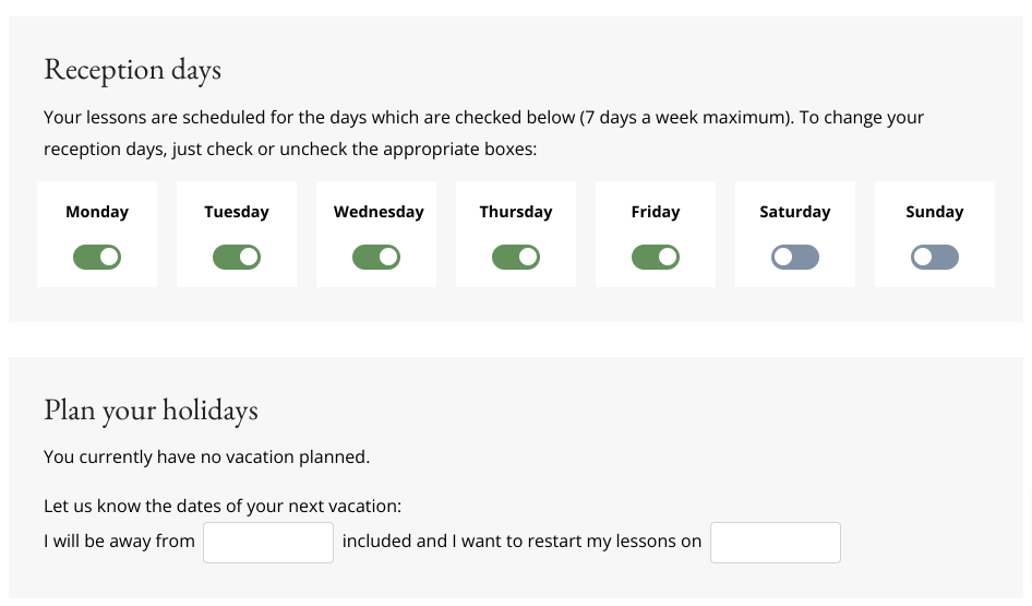 You can change your reception days at any time in your User Space under "Settings" > "Lesson Settings".