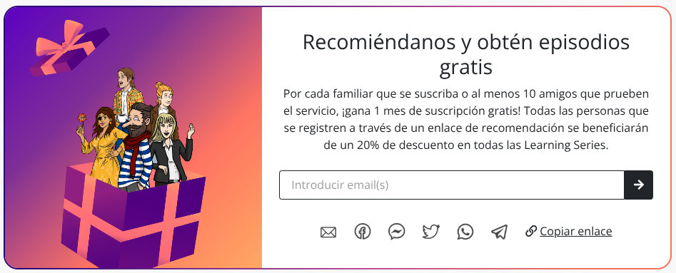 Por cada familiar que se suscriba o al menos 10 amigos que prueben el servicio, ¡gana 1 mes de suscripción gratis!