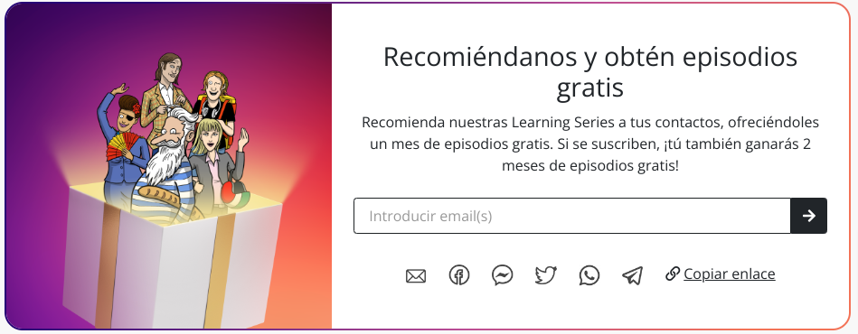 ¡Recomienda nuestros cursos ofreciendo un mes de formación a tus contactos! Si después uno o más de ellos compran una suscripción, ganarás meses gratis de clases. Puedes recomendar nuestros cursos a través de: