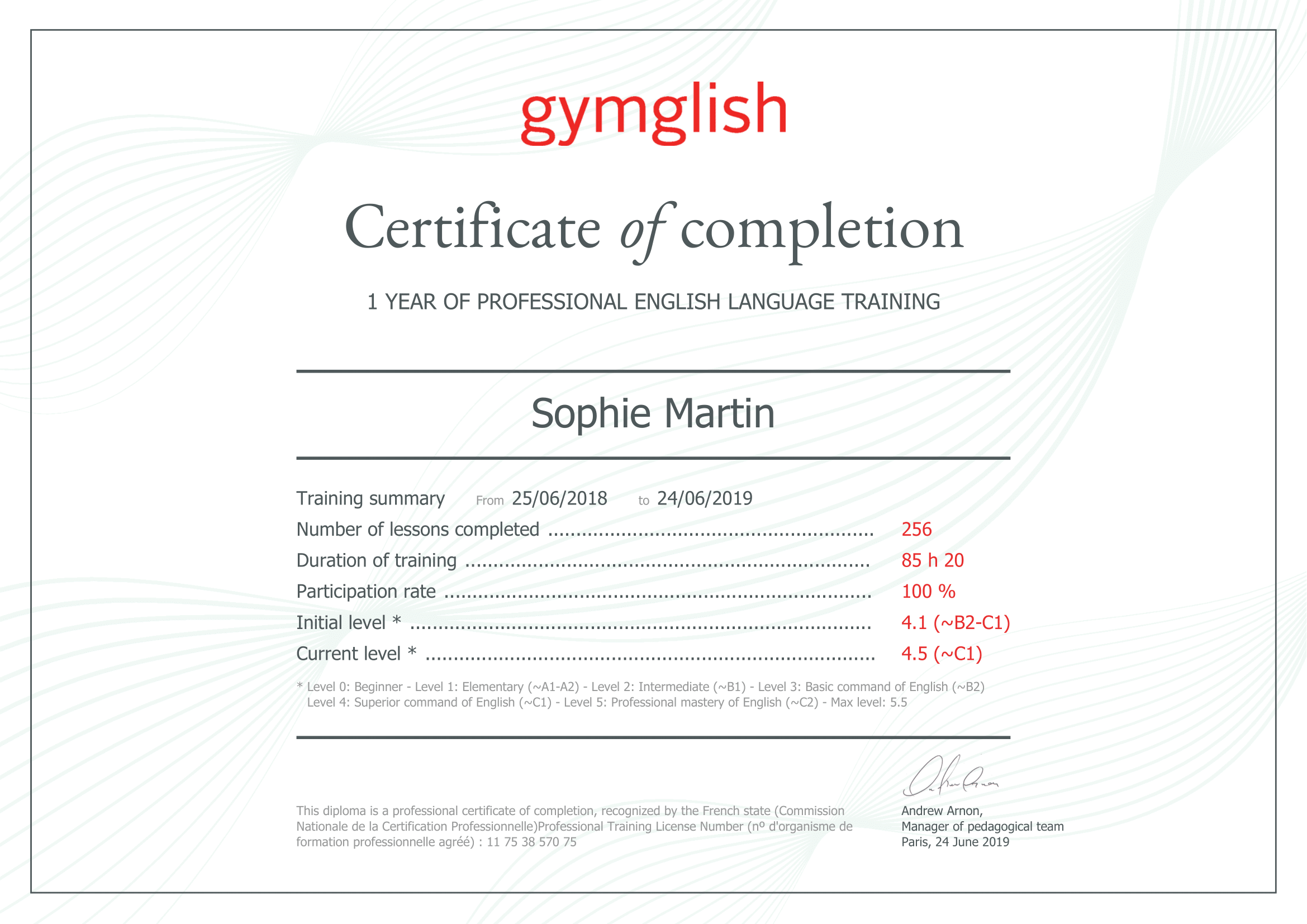 Al final de tu período de suscripción (mínimo 6 meses), recibirás un diploma que detalla tu nivel y progreso. Este documento proporciona información no solo sobre el nivel alcanzado al final de la capacitación, sino también sobre los esfuerzos de aprendizaje y revisión realizados a lo largo del curso, la tasa de participación, el tiempo de capacitación, la cantidad de lecciones efectuadas, etc.