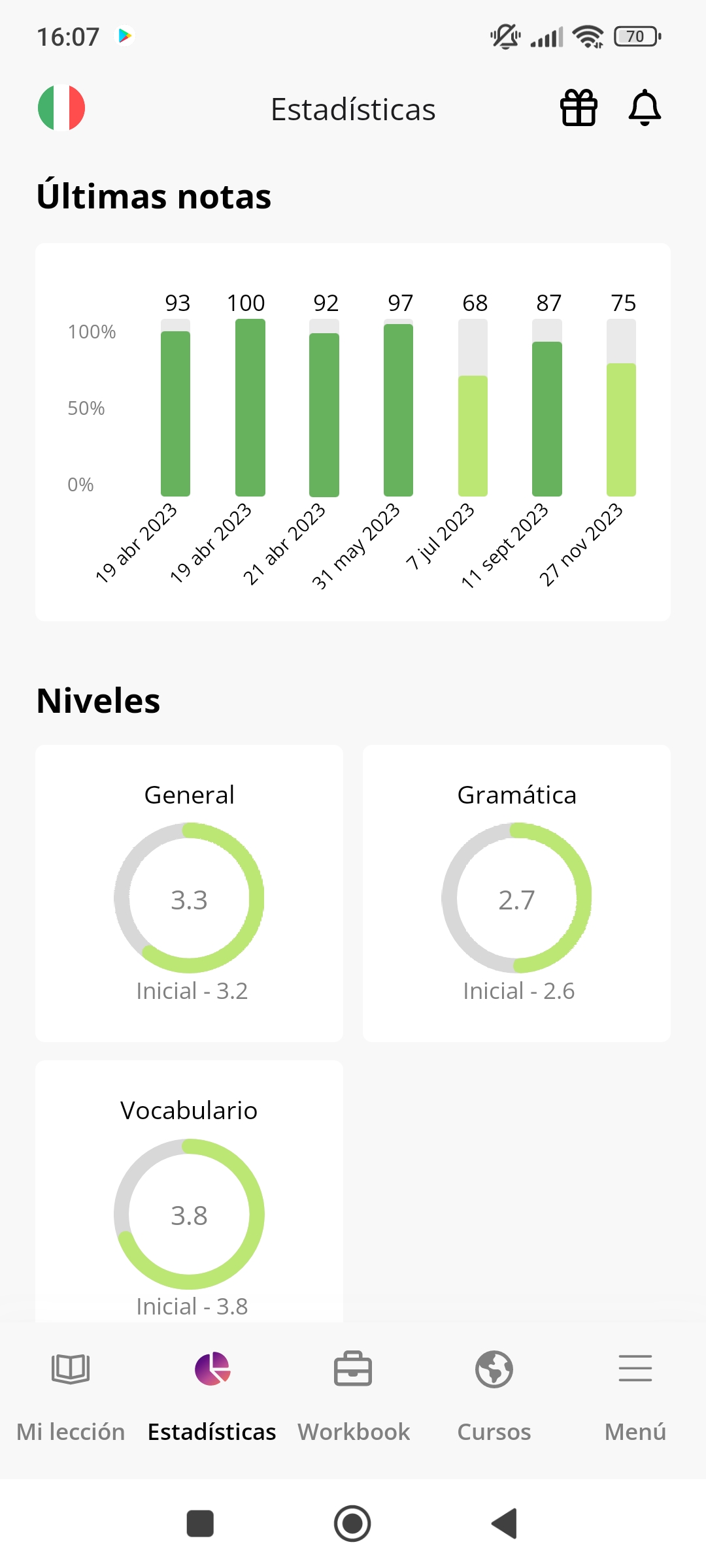 Para consultar tus estadísticas de nivel y progresión desde nuestras aplicaciones, haz clic en el botón "Estadísticas", que aparece en la parte inferior de la pantalla.