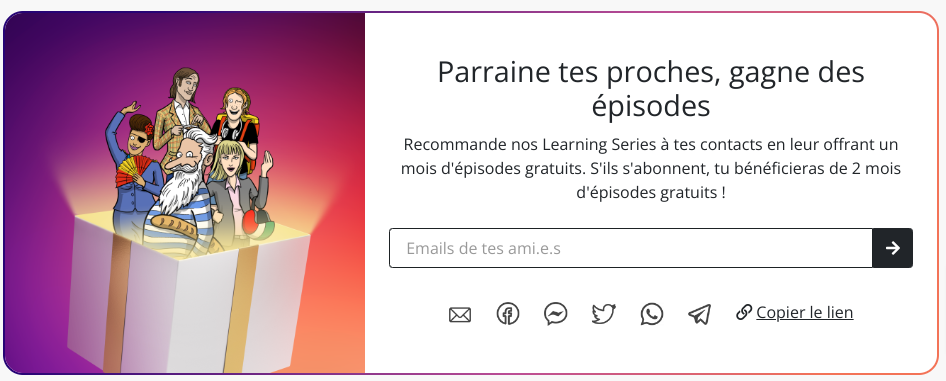 Recommandez nos cours en offrant un mois de formation à vos contacts ! Si vos filleuls s'abonnent par la suite, vous gagnez automatiquement des mois d'abonnement. Vous pouvez recommander nos cours depuis :