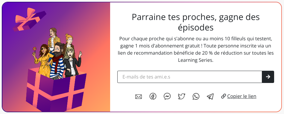 Pour chaque proche qui s'abonne ou au moins 10 filleuls qui testent, gagne 1 mois d'abonnement gratuit !
