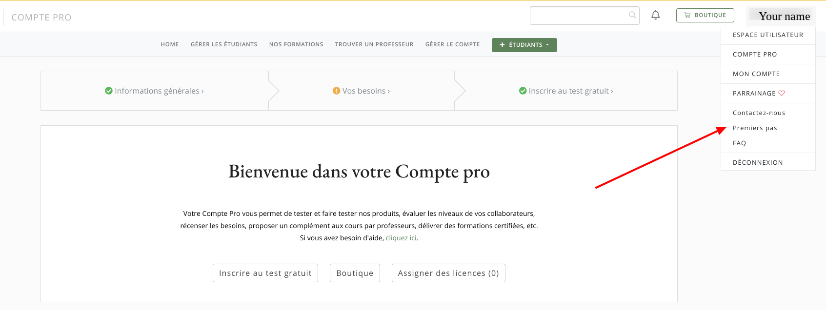 Si vous souhaitez avoir un aperçu des fonctionnalités de votre compte PRO, nous vous invitons à cliquer sur votre nom en haut à droite puis sur "Premiers pas".