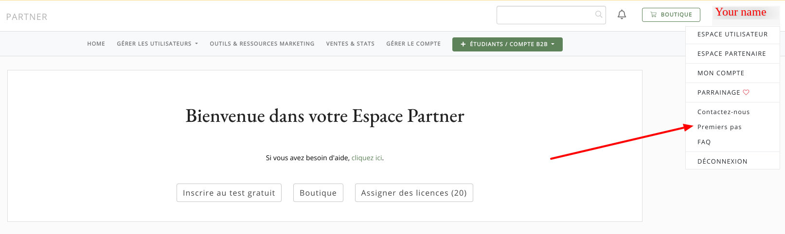 Si vous souhaitez avoir un aperçu des fonctionnalités de l'Espace Partenaire, nous vous invitons à cliquer sur votre nom en haut à droite puis sur "Premiers pas".