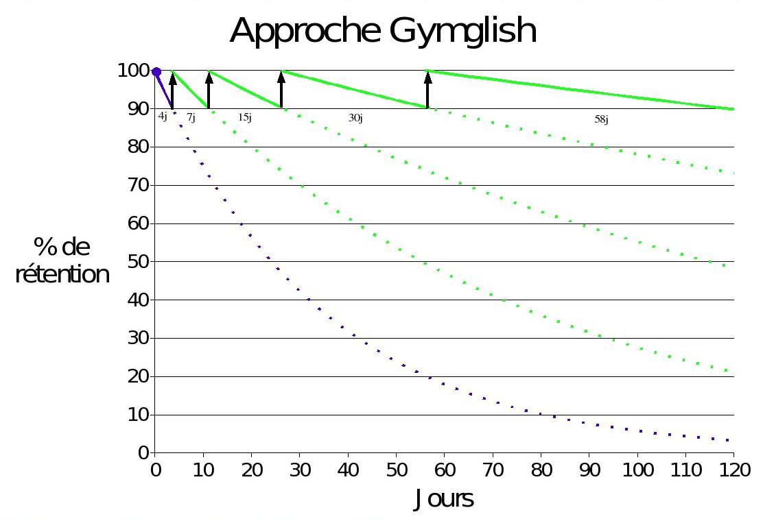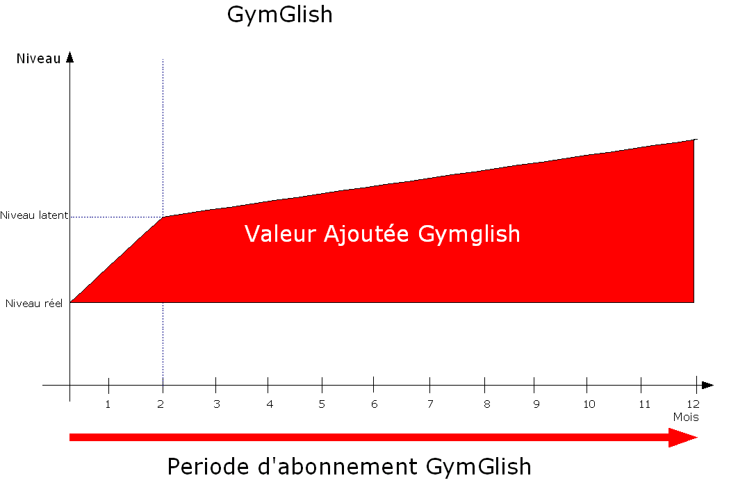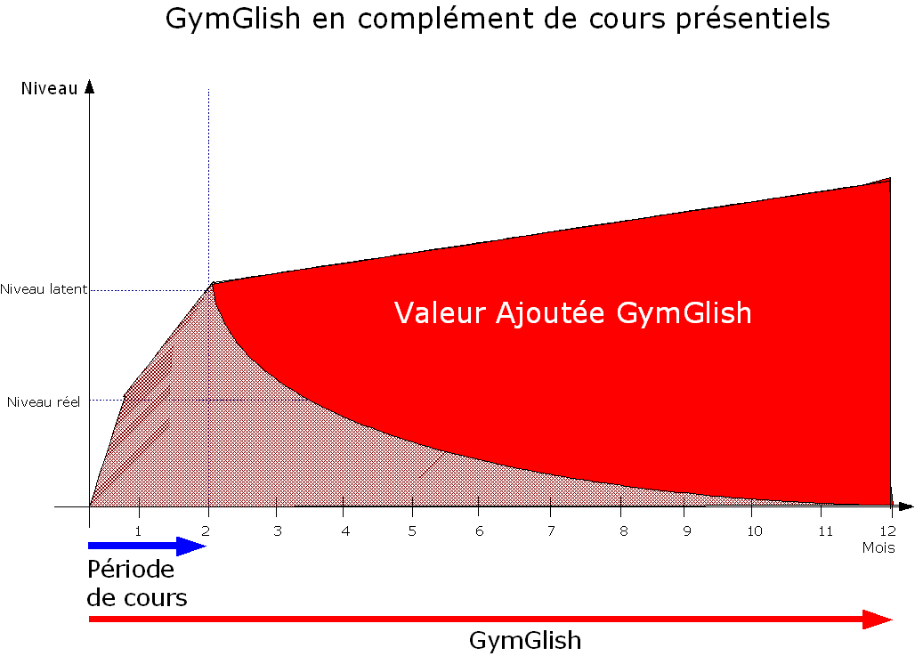 Gymglish, utilisé sans autre complément de formation, présente une courbe de progression plus lente que celle des cours présentiels, car l'effort est dilué dans le temps. Comme pour les cours présentiels, l' utilisateur retrouve son niveau latent, puis continue à progresser. La courbe ci-dessus met en relief la grande valeur ajoutée de Gymglish : consolider les acquis dans le temps.