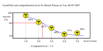 Grâce à l'expérience et au temps passé par notre équipe pédagogique, nous avons finalement choisi la limite de niveau sur la réalisation de 60% de réussite sur une sigmoïde tangente hyperbolique ayant pour limites 100% et 0%, ce qui veut dire que si un utilisateur à un pourcentage de réussite de 60% à nos tests de niveau 3, et les taux de réussites correspondants pour les autres niveaux, il sera dit être de niveau 3. Ceci est explicité sur le graphe suivant :
